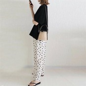ワイドパンツ レディース ボトムス ドット柄 ロングパンツ 春夏パンツ 水玉 大きいサイズ ゆったり 長ズボン ストレート 美シルエット ワイドパンツ カジュアル ウェストゴム 春夏 薄手 ロング丈 | gizshop