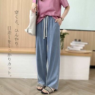 デニムパンツ レディース ワイドパンツ ウエストゴム デニム 接触冷感 春 夏 ひんやり UVカット 無地 薄手 涼しい ロング丈 ストレートパンツ ジーンズ ゆるパンツ ガウチョ 体型カバー ボトム | gizshop