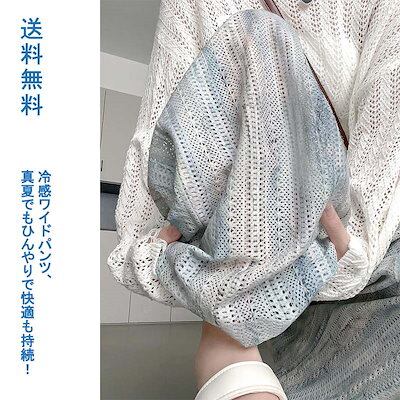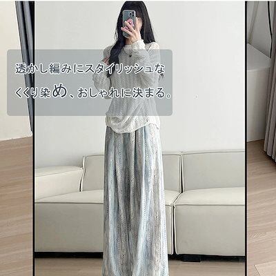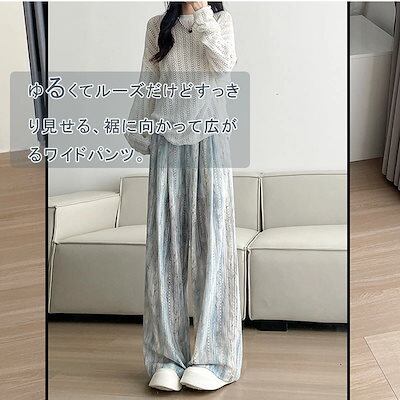 ワイドパンツ レディース ボトムス パンツ ロング丈 くくり染め 透かし 冷感素材 落ち感 インナー付き ポケット付き ハイウエスト ブルー ゆったり 薄手 カジュアル 体型カバー ストレッチ おしゃ | gizshop