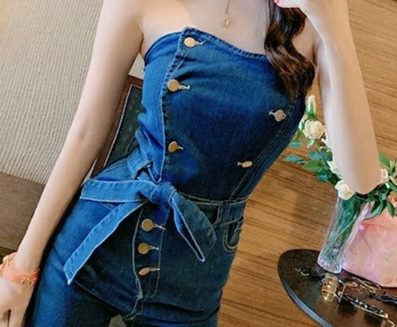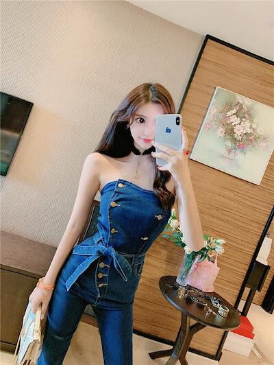 デニムパンツ レディース ジャンプスーツ オールインワン パンツ デニム スリム タイト セクシー おしゃれ 可愛い リボン チューブトップ アンクルパンツ 9分丈パンツ ノースリーブ ハイウエスト
