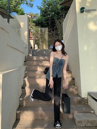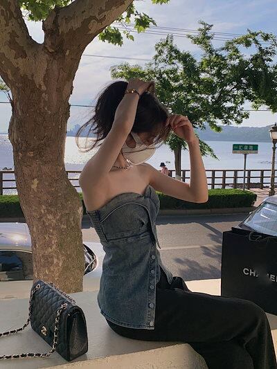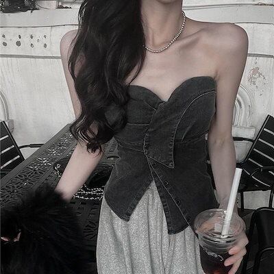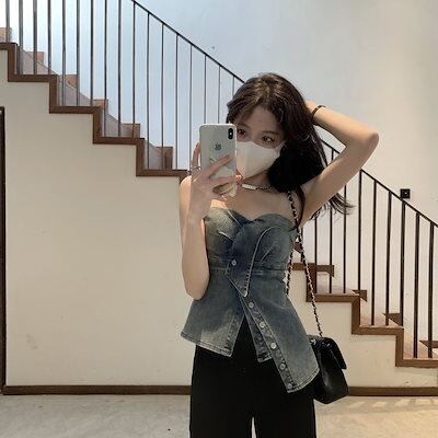 夏 2色 純欲風ギャル イレギュラー 外着 チューブトップブラ デニムトップス レディース 韓国