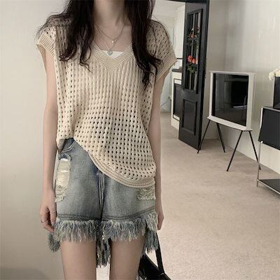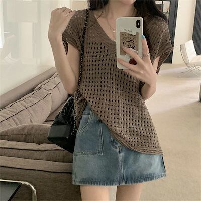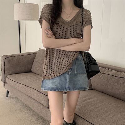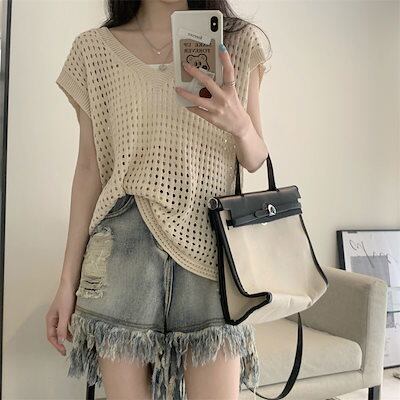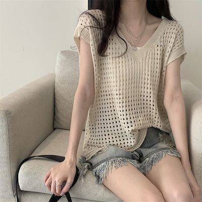 レディース 涼感 夏 カジュアル Vネックトップス人気 ゆったり サマー ニット キャミソール ノースリーブ ブラウス タンクトップ 着痩せ 薄手