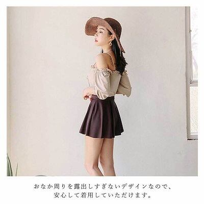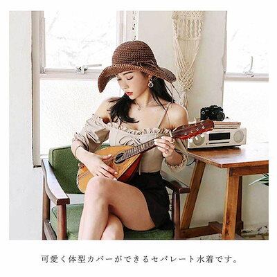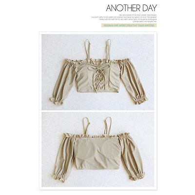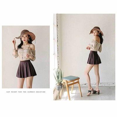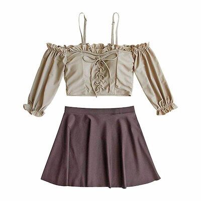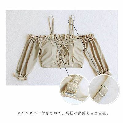 水着 レディース 2点セット ビキニ かわいい 韓国 オフショル カップ 二の腕カバー セパレート ベージュ ブラウン レースアップ お洒落 セクシー 海 ビーチ