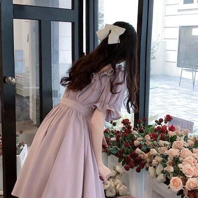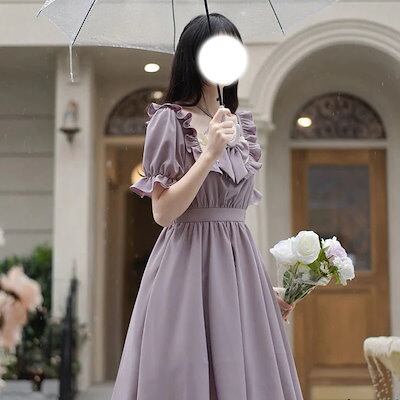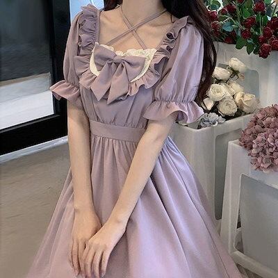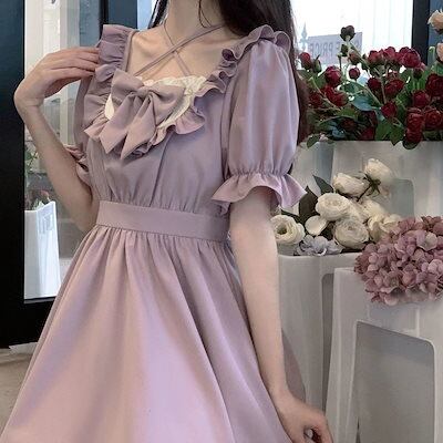 愛されドッキングワンピース夏の日系学生のウエストを丸くした可愛いリボン芋紫姫バブリースリーブワンピースlolitaワンピース ドレス