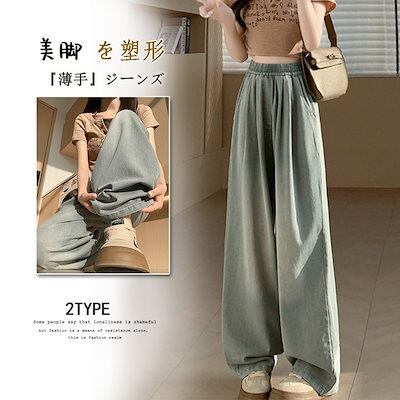 夏 ひんやり ズボン 韓国 ボトムス ジーンズ 新作 ハイウエスト レトロ ワイドパンツ ロングパンツ脚長効果!ジーンズ