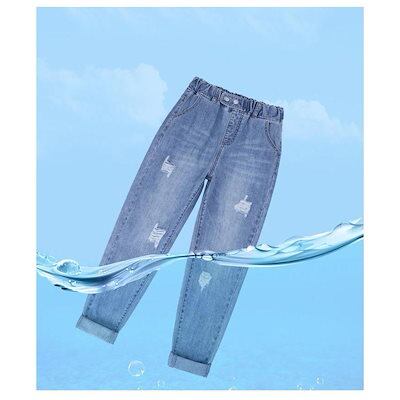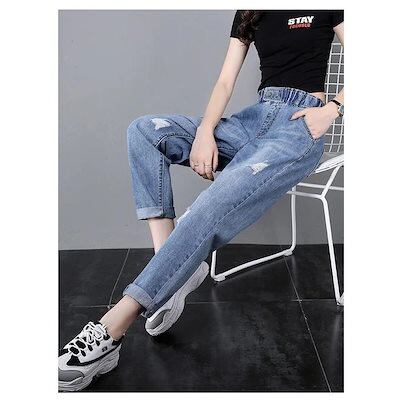 春秋ハイウエストボトムジーンズデニムパンツレディース9パンツウエストゴムジーンズブルー特大破れジーンズ