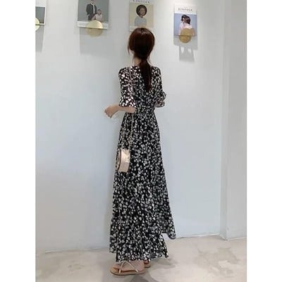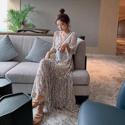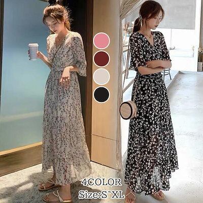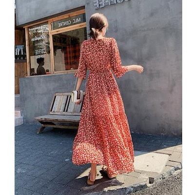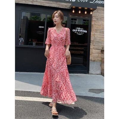 花柄ワンピース 半袖 ワンピース vネック フレア ミモレ ひざ下丈 ロング ウェストゴム レディース レトロ 小花柄 着痩せ 春夏