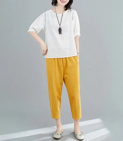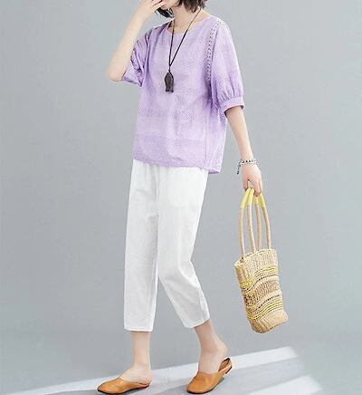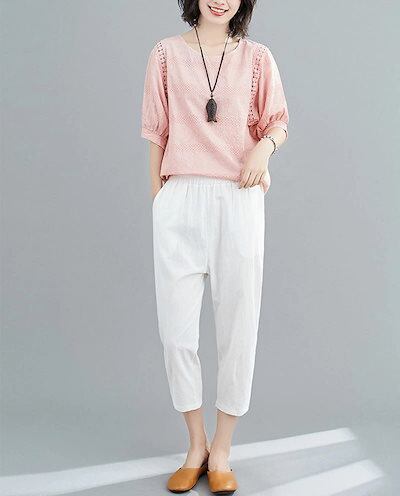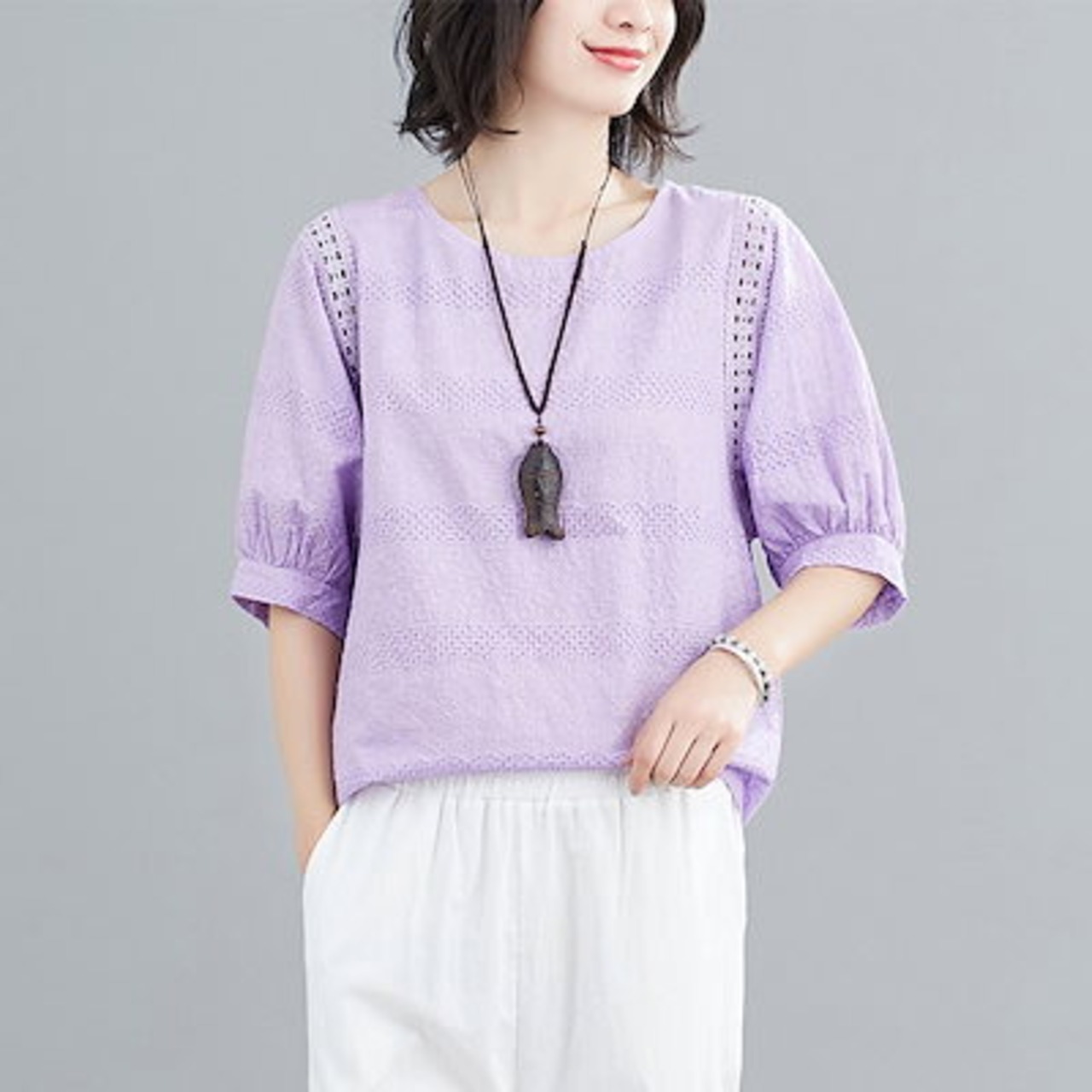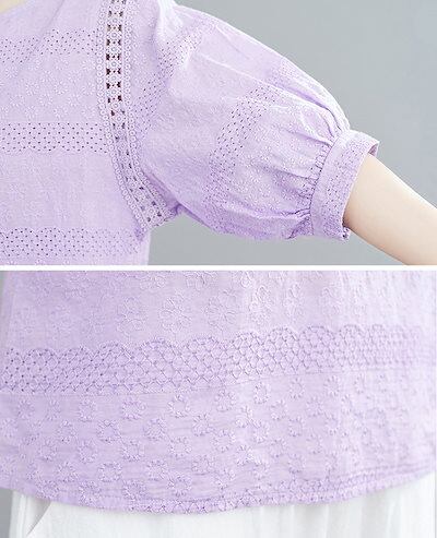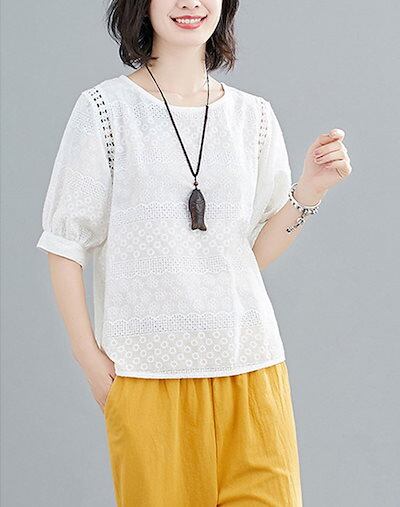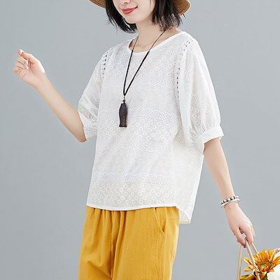 刺繍ブラウス レディース 綿 半袖ブラウス 半袖 透かし彫り クルーネック シャツブラウス 刺繍 夏 プルオーバー Tシャツ 透け感 コットン トップス 無地 ホワイト シャツ ブラウス 体型カバー