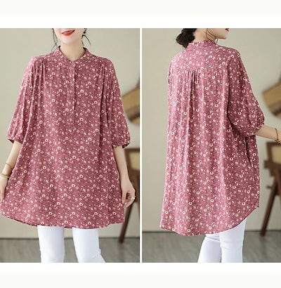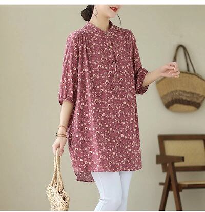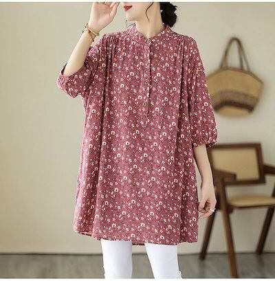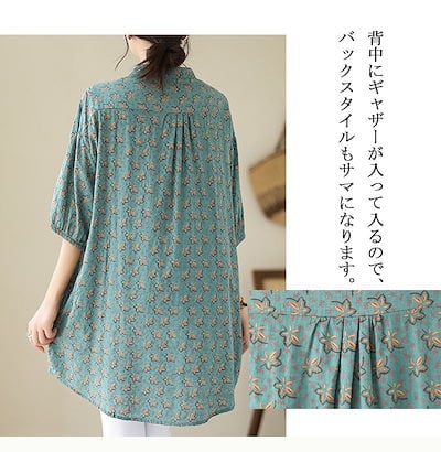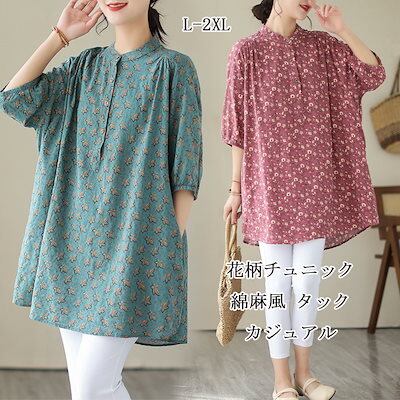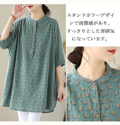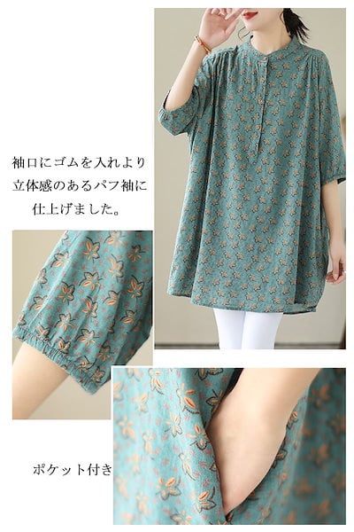 チュニック 花柄 ブラウス 半袖 レディース シャツ ロング丈 タック ギャザー シャツブラウス パフスリーブ スタンドカラー ボタン ゴム 綿麻風 トップス ゆったり 大きいサイズ 無地 きれいめ