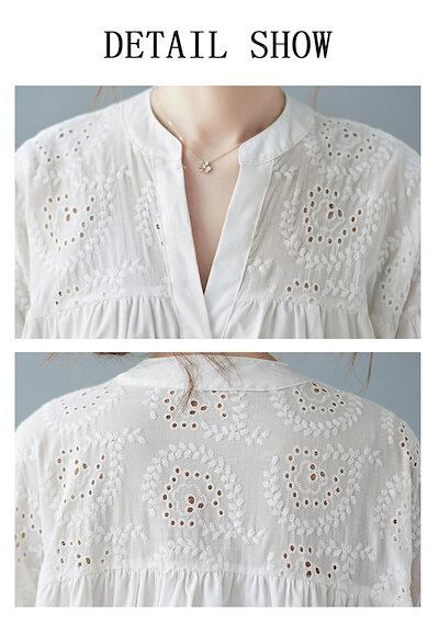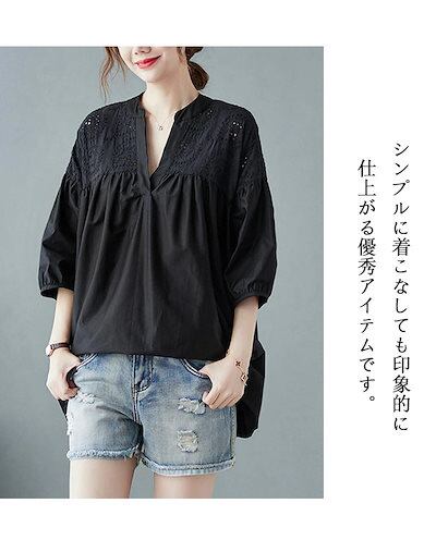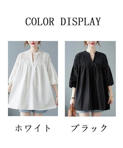 パフスリーブ ブラウス レディース 半袖 チュニック 透かし彫り 刺繍 Vネック ギャザー シャツブラウス ロング 春夏 タック プルオーバー トップス 大きいサイズ ゆったり 薄手 無地 ブラック