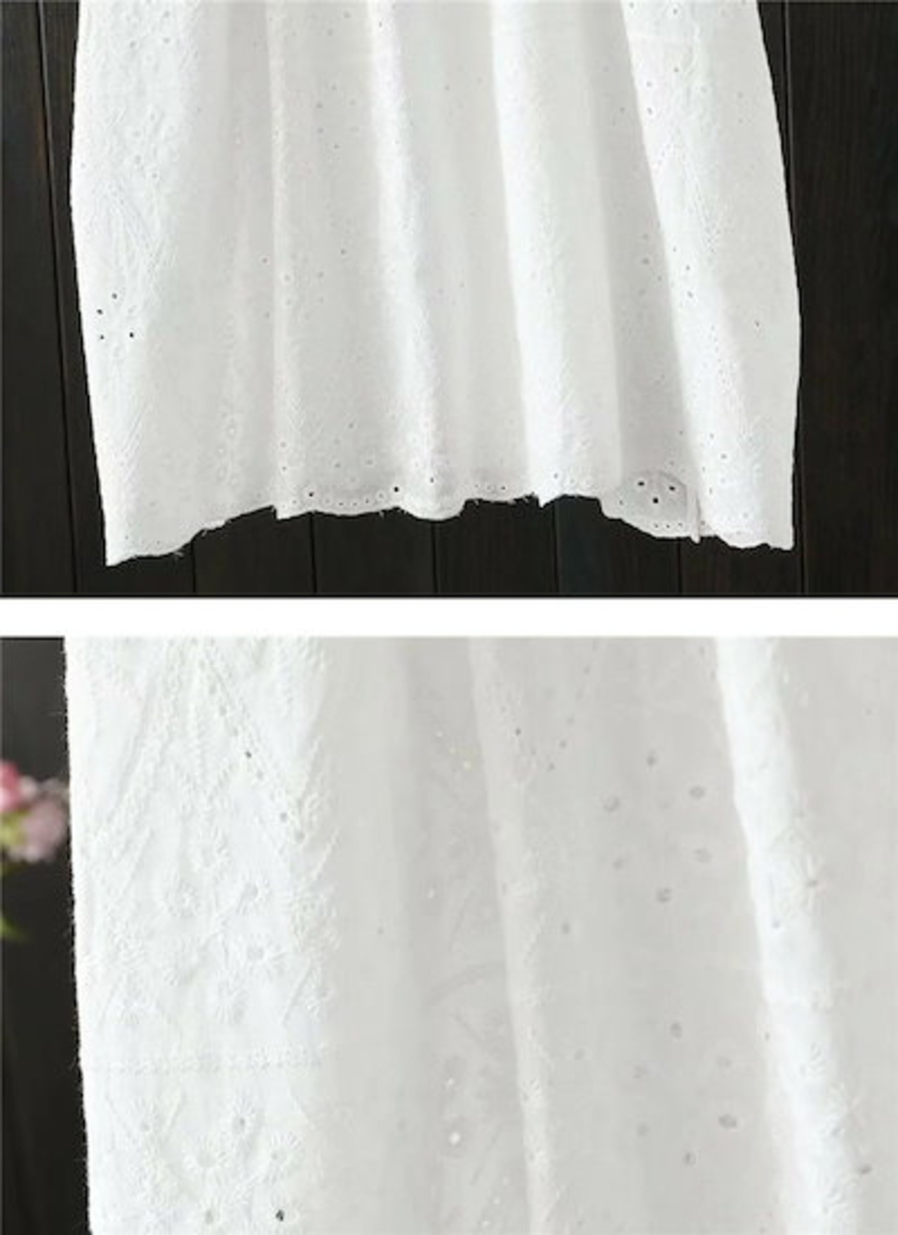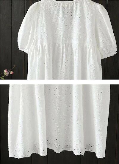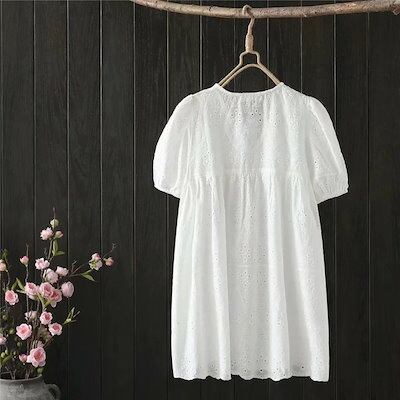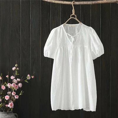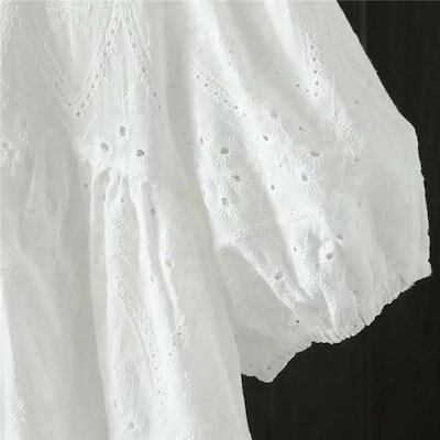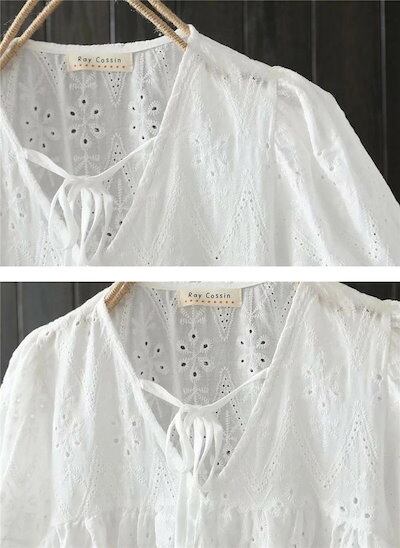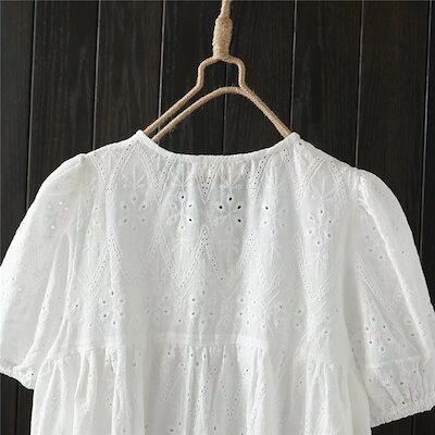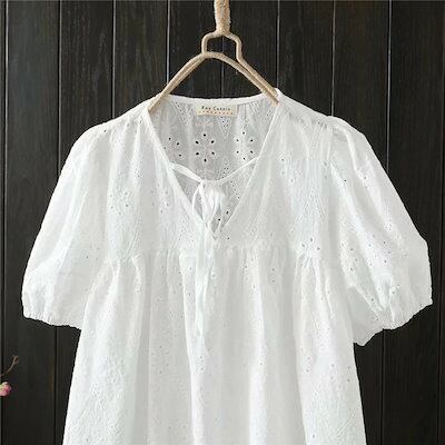 ブラウス レディース 綿 半袖ブラウス 半袖 透かし彫り タック シャツブラウス vネック リボン シャツ 刺繍 夏 プルオーバー Tシャツ 透け感 コットン トップス 無地 ホワイト 体型カバー ゆ