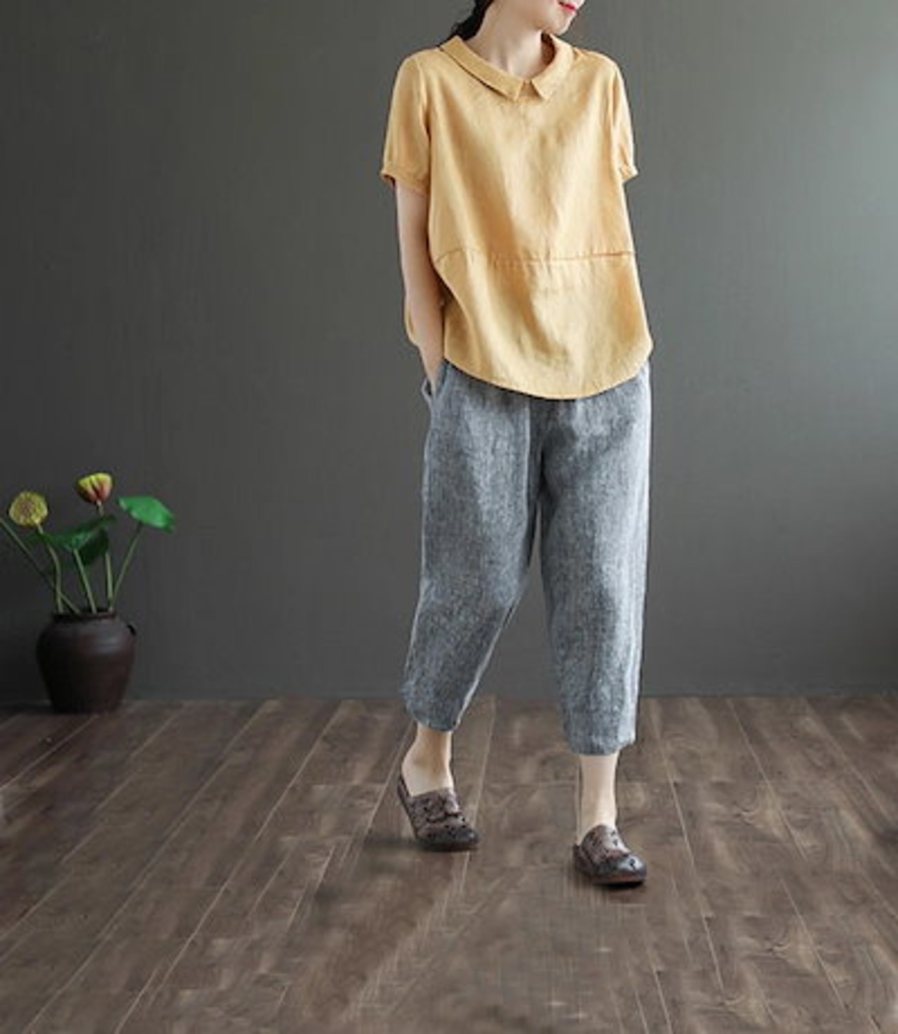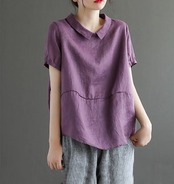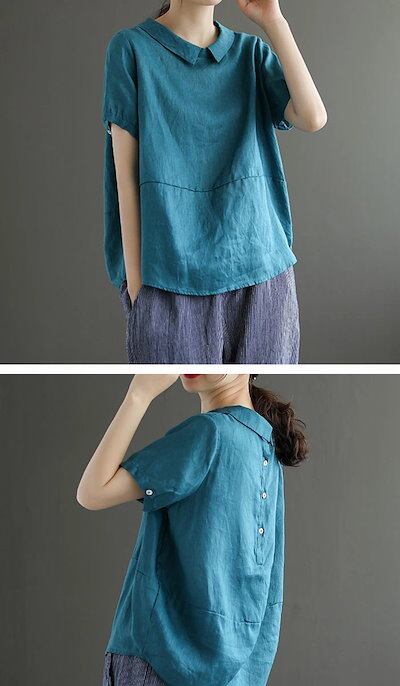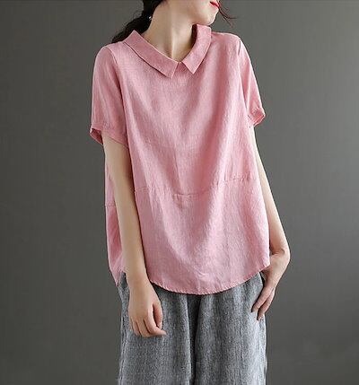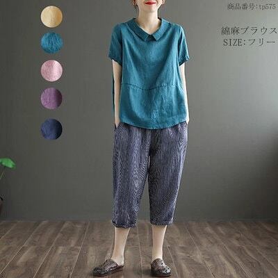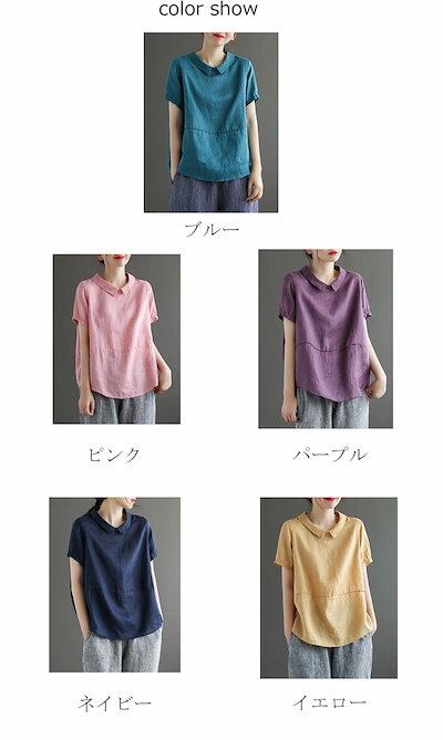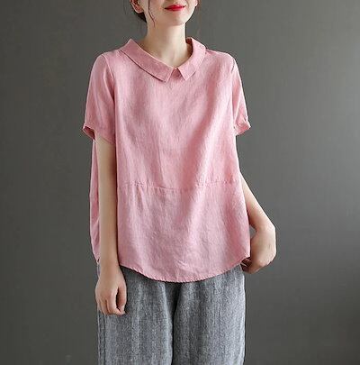 ブラウス 半袖 レディース 夏 トップス 綿麻 プルオーバー 無地 折り襟 ドッキング カジュアル ゆったり 着まわし 体型カバー 着痩せ