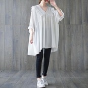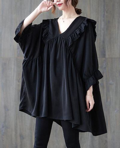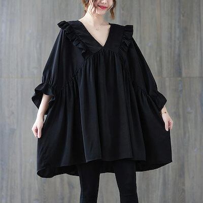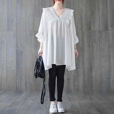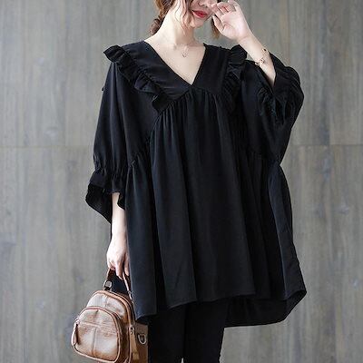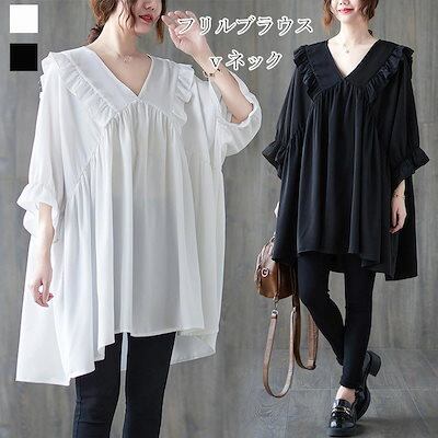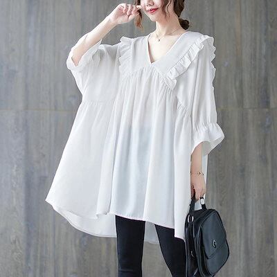 フリルブラウス レディース 夏 フリル チュニック vネック ドッキング 半袖ブラウス タック 半袖 トップス プルオーバー フレア 無地 Tシャツ 体型カバー ゆったり カジュアル シャツブラウス