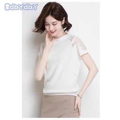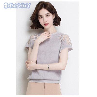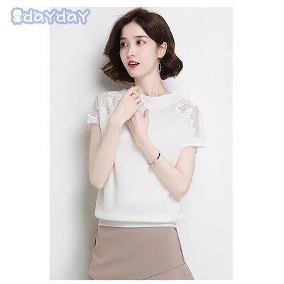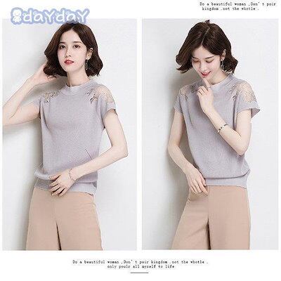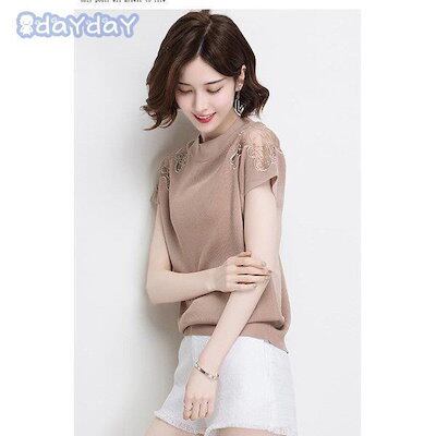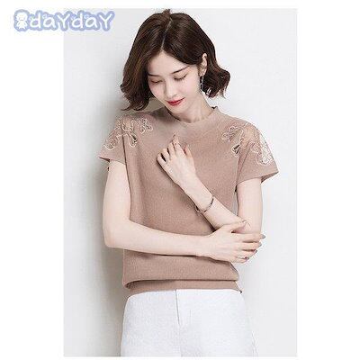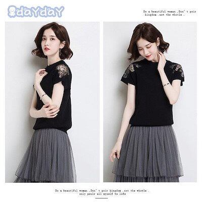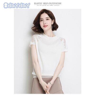 【今季トレンド】Tシャツ ニットソー レディース 春夏 半袖カットソー レースチュールニットTシャツ 無地 カットソー ストレッチ オシャレトップス白 冷房対策 通勤 オシャレ