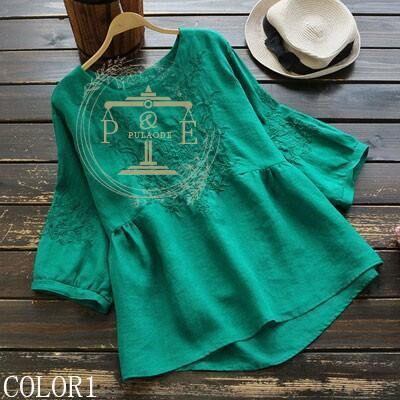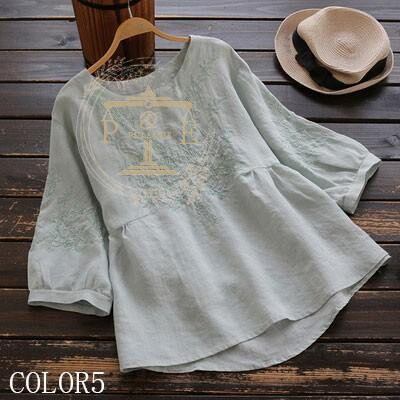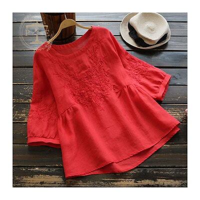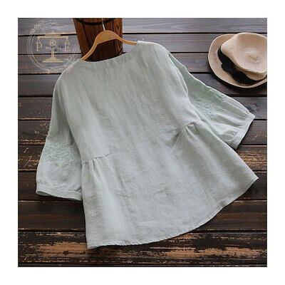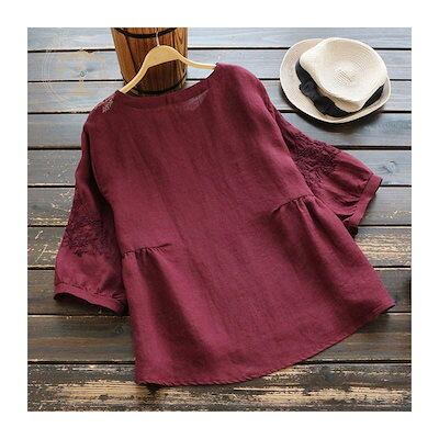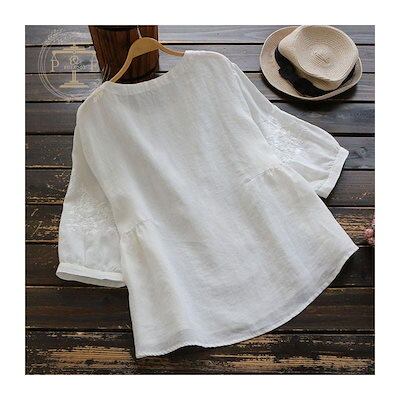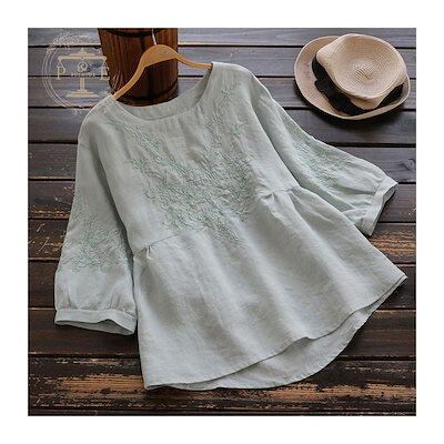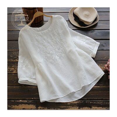 【人気商品超目玉】ブラウス レディース 春夏 リネン 刺繍 トップス チュニック 半袖 ラウンドネック 無地 体型カバー ゆったり 大きいサイズ プルオーバー カットソー お洒落