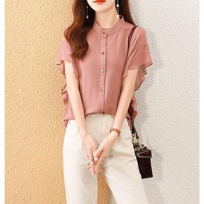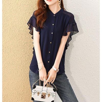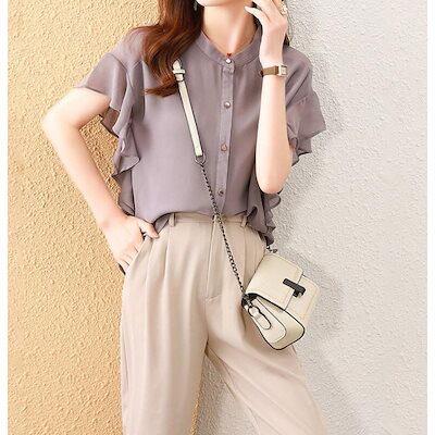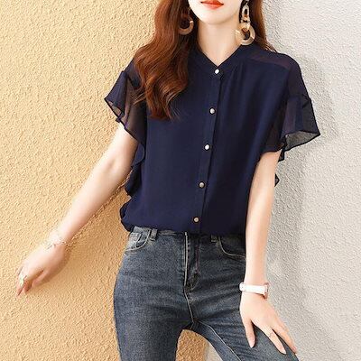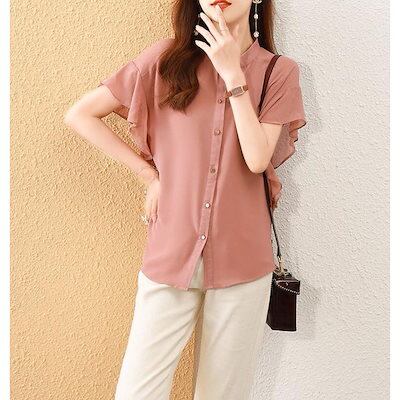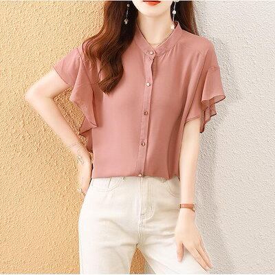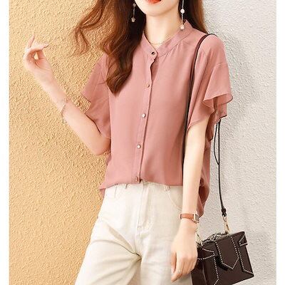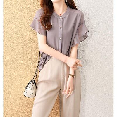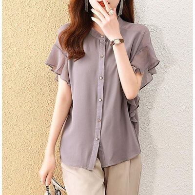 新作 シャツ ブラウス レディース 柔らかい 夏 涼しい ゆったり 半袖 前開き シフォン 着回し 気質 上品 無地 フレア袖 オフィス ビジネス 事務服