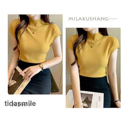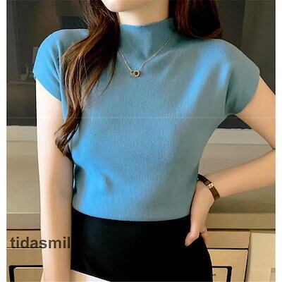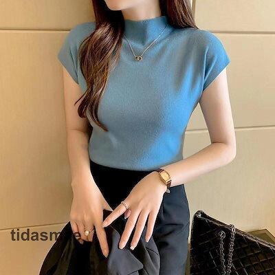 カットソー レディース 半袖 Tシャツ ハイネック 春夏 トップス サマーニット 薄手 ゆったり プルオーバー ストレッチ 黒 無地 通勤 OL