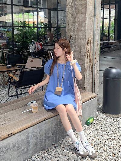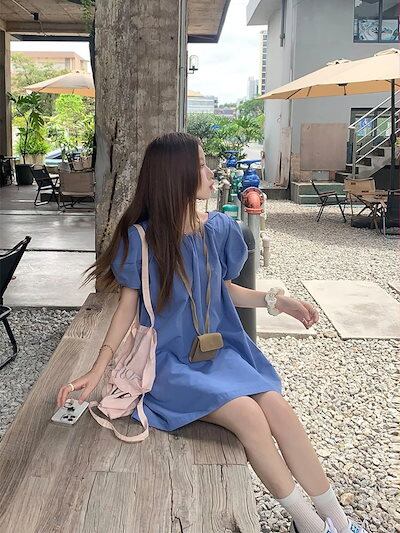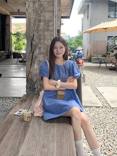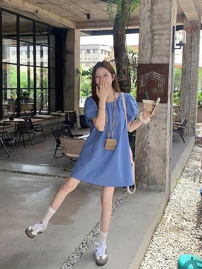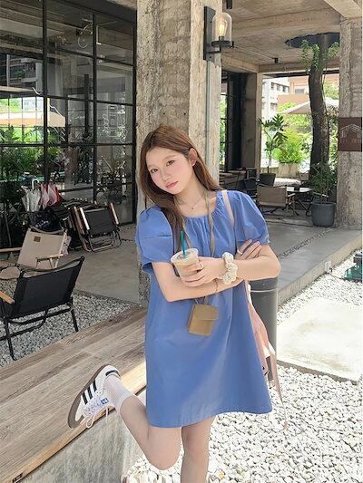 2024 春夏ワンピース 半袖 ミニ丈 Aライン ラウンドネック ゆったり 細見え 夏 青 ブルー シンプル おしゃれ かわいい 無地 韓国ファッション レディース お出かけ