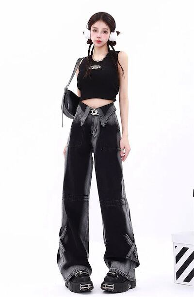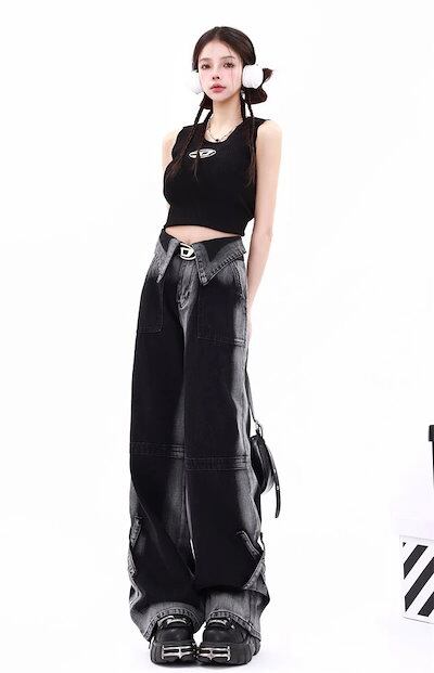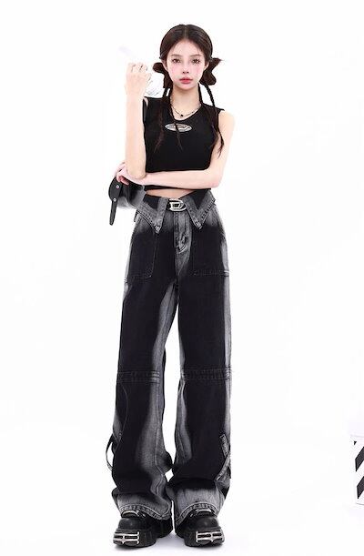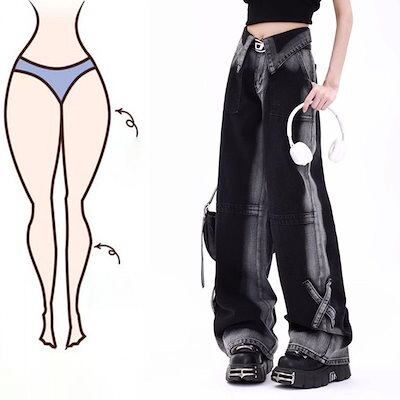 大きいサイズアメリカンレトロデザインセンス衝突ジーンズ女性秋冬ストレートワイドパンツ潮