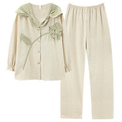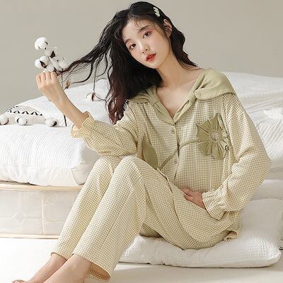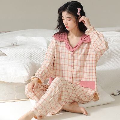 2023人気新作ルームウェアセットアップ折襟長袖トップスロングパンツ上下二点春夏服レディース部屋着韓国ファッションチェックプリント肌にやさしい色褪せない