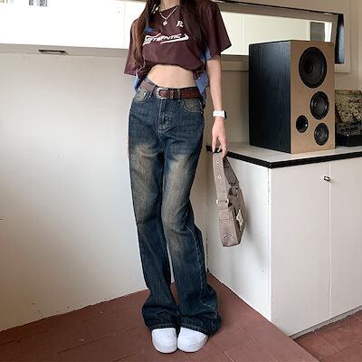 デニムかっこいい!スラックスパンツ2025春 マイクロラッパ デニムパンツ おしゃれレディース ワイドレッグモップパンツ アメリカンレトロ ハイウエストでゆったり 見えやせ 垂れ感