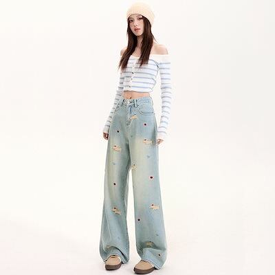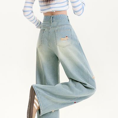 デニムかっこいい!スラックスパンツシンプルカジュアル 2025春 ダックスフント ワイドパンツ デニムパンツ 刺繍 ハイウエストゆったり見えやせ パンツ レディース