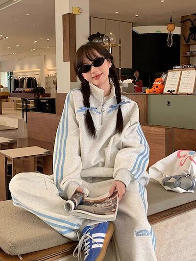 2024 秋冬 韓国 かわいい 2点セット 厚手裹起毛レディース 長袖アウターレトロ黑白上下ハーフサイズ丈トップス春カジュアルスポーツファッション系通学学生袖お出かけアップシルエットサイドトラック羽織