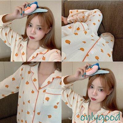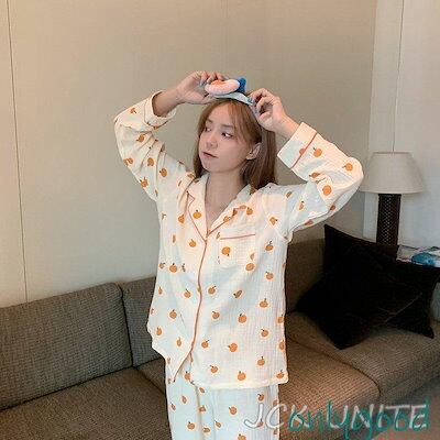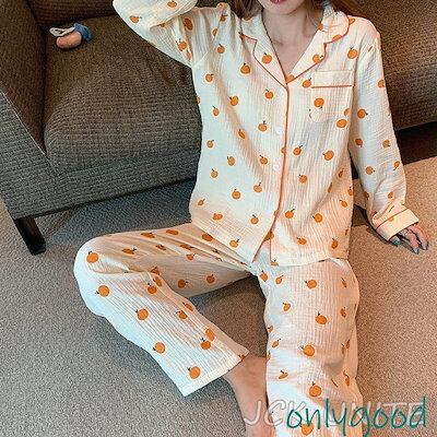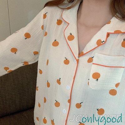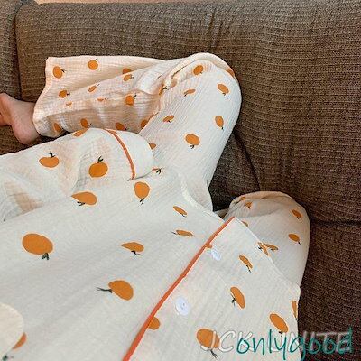 パジャマ レディース 春 秋 長袖 パジャマ ロングパンツ 花柄 ルームウェア 上下セット オレンジ 前開き パジャマ 可愛い 部屋着 韓国風 寝巻き パジャマ