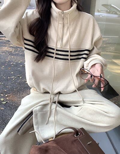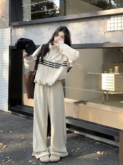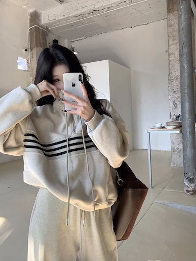 2024 秋冬 韓国 かわいい レディース厚手 裹起毛無地ハイネック長袖アウターレトロセット黑白フーディーハーフサイズ丈トップス春カジュアルスポーツファッション系通学学生袖お出かけアップシルエット