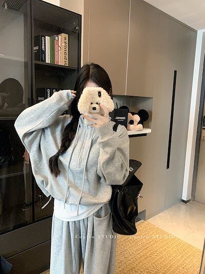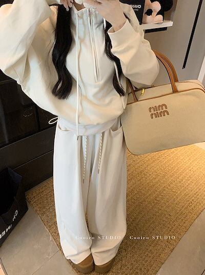2024 秋冬 韓国 かわいい レディース 無地ハイネック長袖アウターレトロセット黑白フーディーハーフサイズ丈トップス春カジュアルスポーツファッション系通学学生袖お出かけアップシルエットトラック羽織