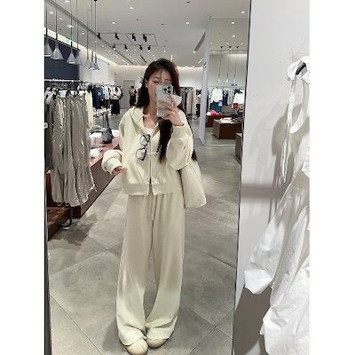 2024 秋冬 韓国 かわいい レディース 無地フード付き長袖アウターレトロセット黑白フーディーダブルサイズ丈トップス春カジュアルスポーツファッション系通学学生袖お出かけアップシルエットトラック羽織り