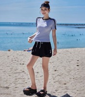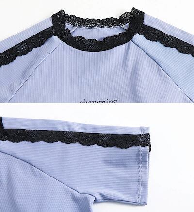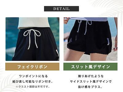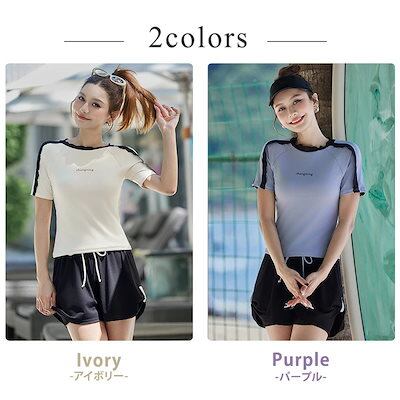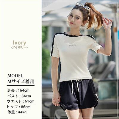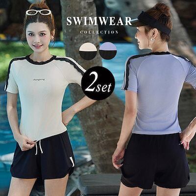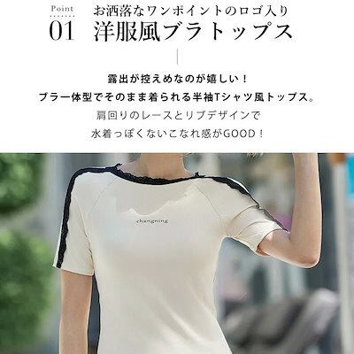 2025新作 水着 体型カバー レディース セパレート リブ 半袖 Tシャツ風 2点セット プルオーバー 肩レース ノンワイヤー パンツ ショーツ一体型 ロゴ ワンポイント サイドスリット風 パッド付