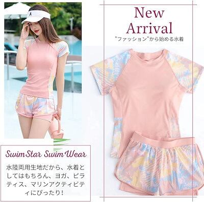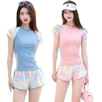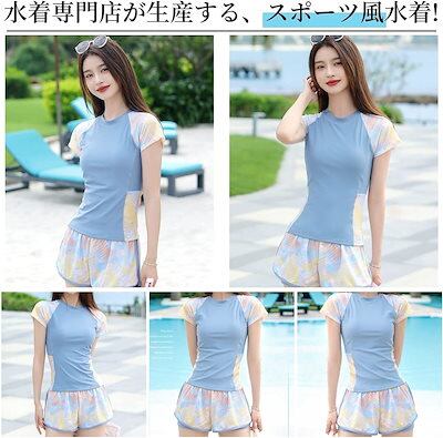 2025春夏新作 2点セット 水着 レディース フィットネス水着 半袖ラッシュガード 体型カバー スポーツ水着 運動水着 スポーティー水着 紫外線対策