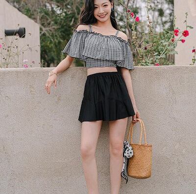 キャミソール ハイウエスト レディース ビキニ 人気 オフショルダー 水着 2025 高校生 女の子 中学生 チェック柄スカート ママ水着 バンドゥ 体型カバー