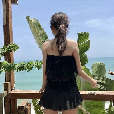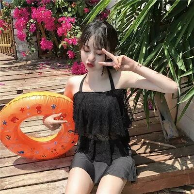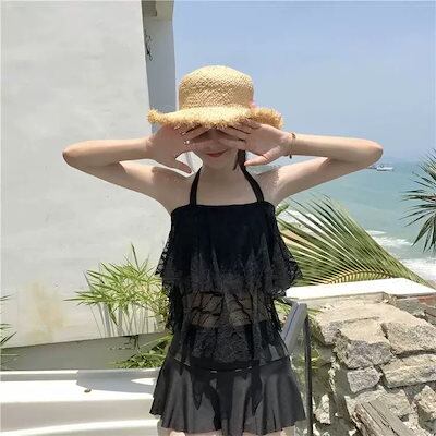 2025 春夏 体型力バー 水着 黒お腹を寄せて痩せ見え スカート風レース水着 旅行 水着 レディース 体型カバー