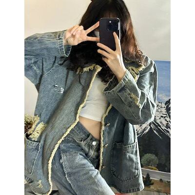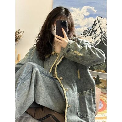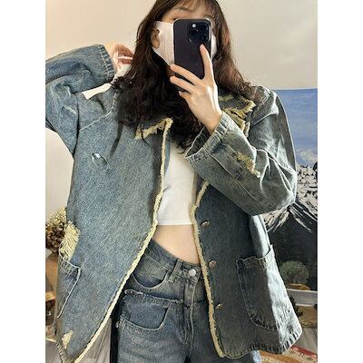 コーデに役立つ!デニムジャケットファッション レトロ港風 ゆったり 破れ デニムコートアウター レディース カジュアル トップス デザインデニムジャケット