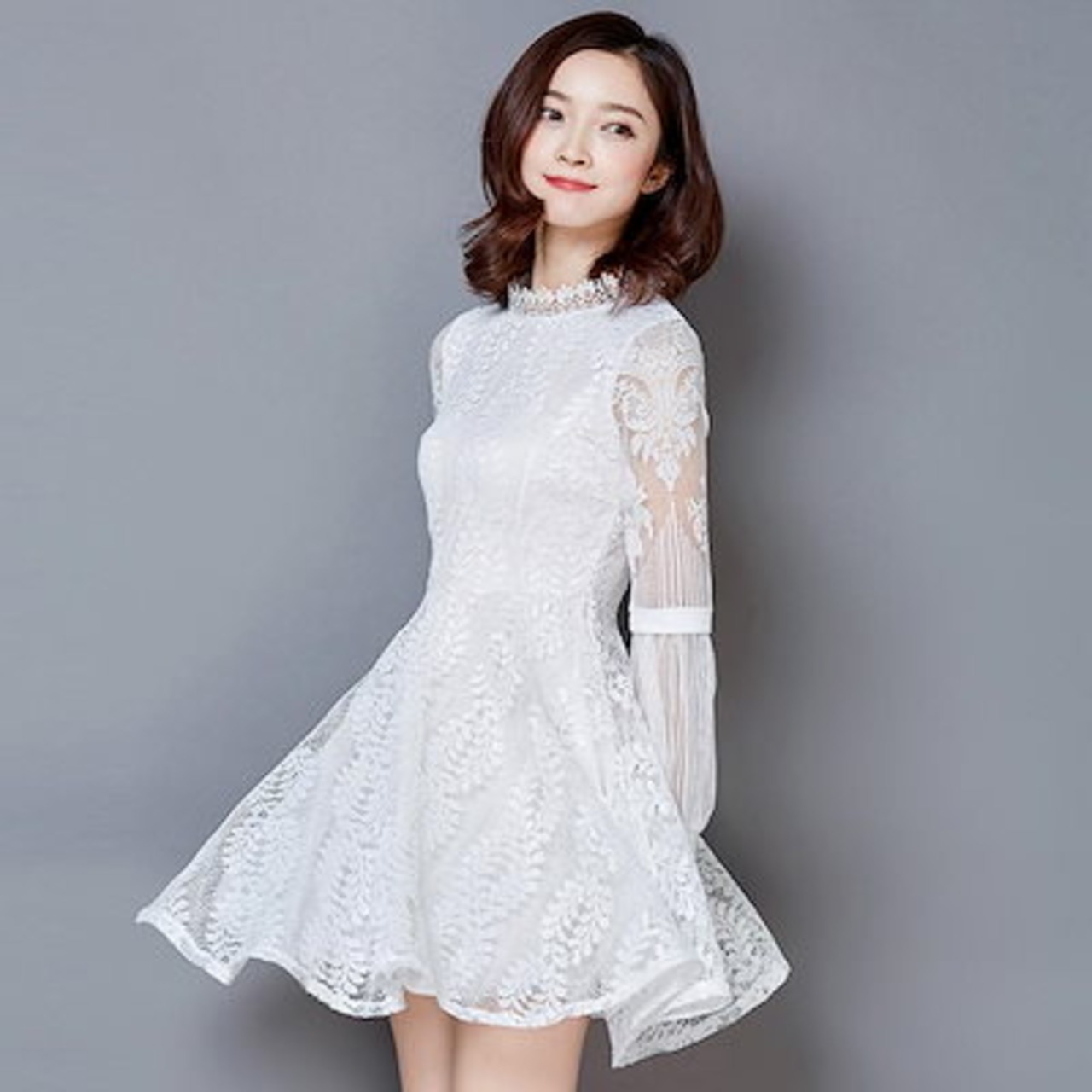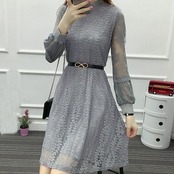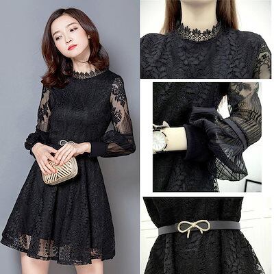 ワンピース 総レース レディース フレアワンピ スカラップ ベルト付き パーティードレス 透け感 パフスリーブ 披露宴