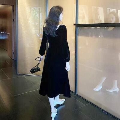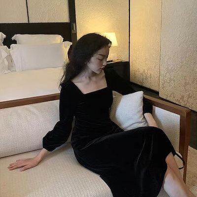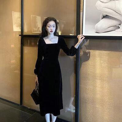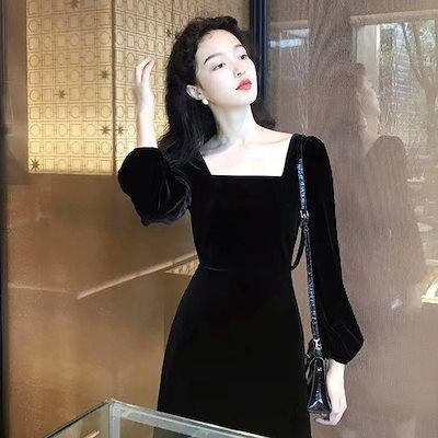 新品追加 ブラック ベルベットワンピース 小柄 レディース カレッジ ファッション