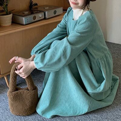フレンチパフ長袖コーデュロイワンピース秋冬 プリーツカジュアル ゆったり 2025新作秋服 ロングワンピース