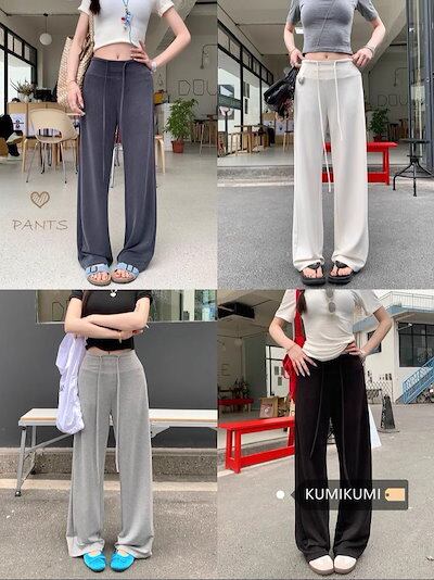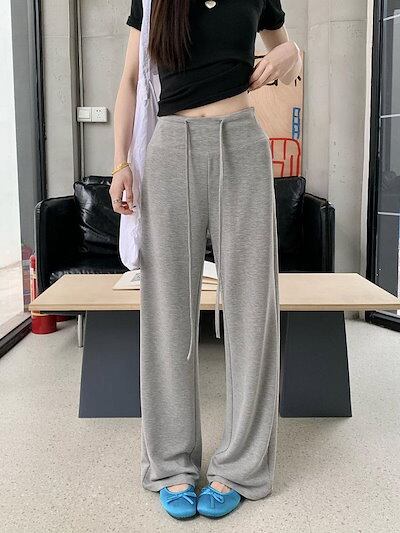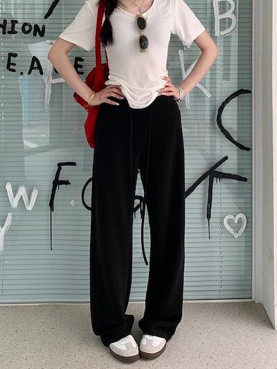 2025春夏 パンツロング丈 ハイウエストゆったりストレートモップパンツウエストゴム 脚長効果美脚効果細見え春カジュアル 黒白韓国系ファッションレディースサイドお出かけおしゃれ かわいい衣装トラック