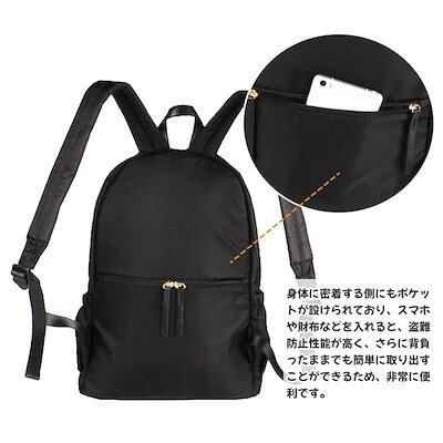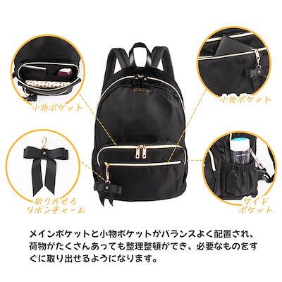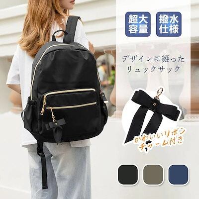 リュック レディース リュックサック バッグ バックバッグ かばん 大容量 A4 背面ポケット 防犯 通学 通勤 シンプル ナイロン 黒 撥水 防水 女子 女性 リボン