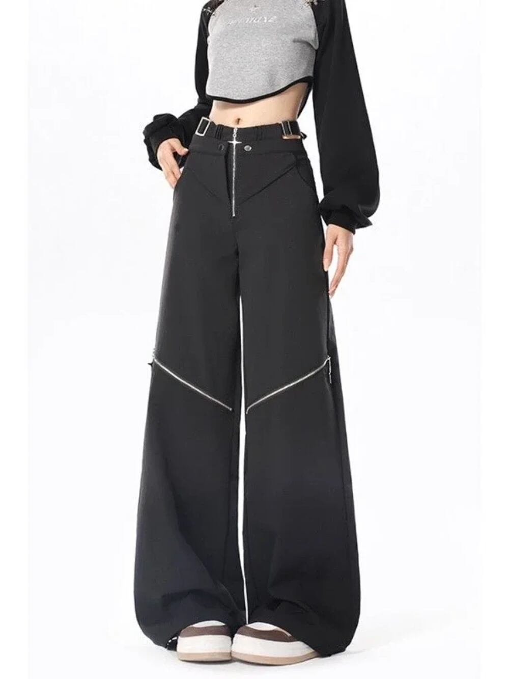 Houzhou-レディースブラックカーゴパンツ、バギーパンクスタイル、ジッパー付きパンツ、ヒップホップ丸gyストリートウェア、ハイウエストパンツ、テックウェア、中空アウト、y2k ボトム ワイドレッグ バギーパンツ T240901063347_01