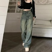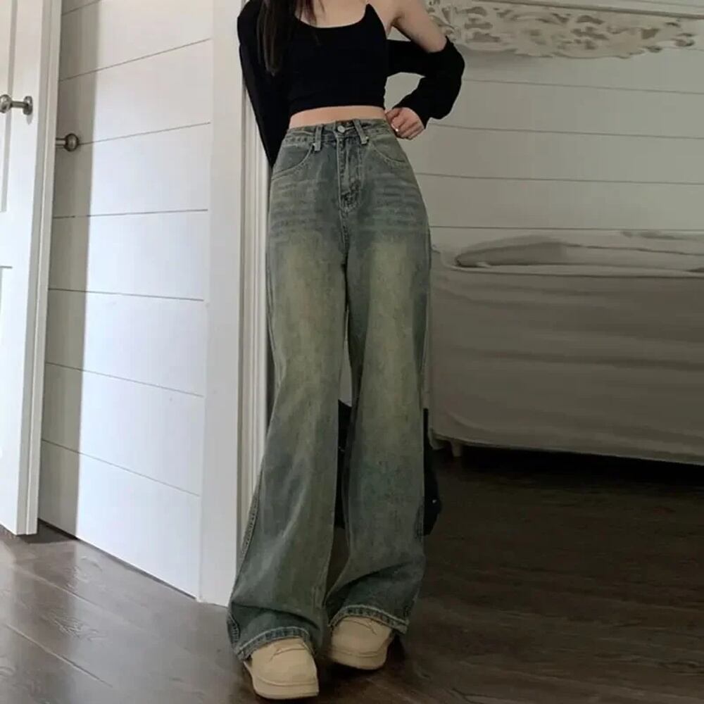 女性用ハイウエストスリミングジーンズ、ベルボトム、ストレートレッグロングパンツ、ヴィンテージとカジュアル、アメリカンスタイル ボトム ワイドレッグ バギーパンツ T240901065724_01