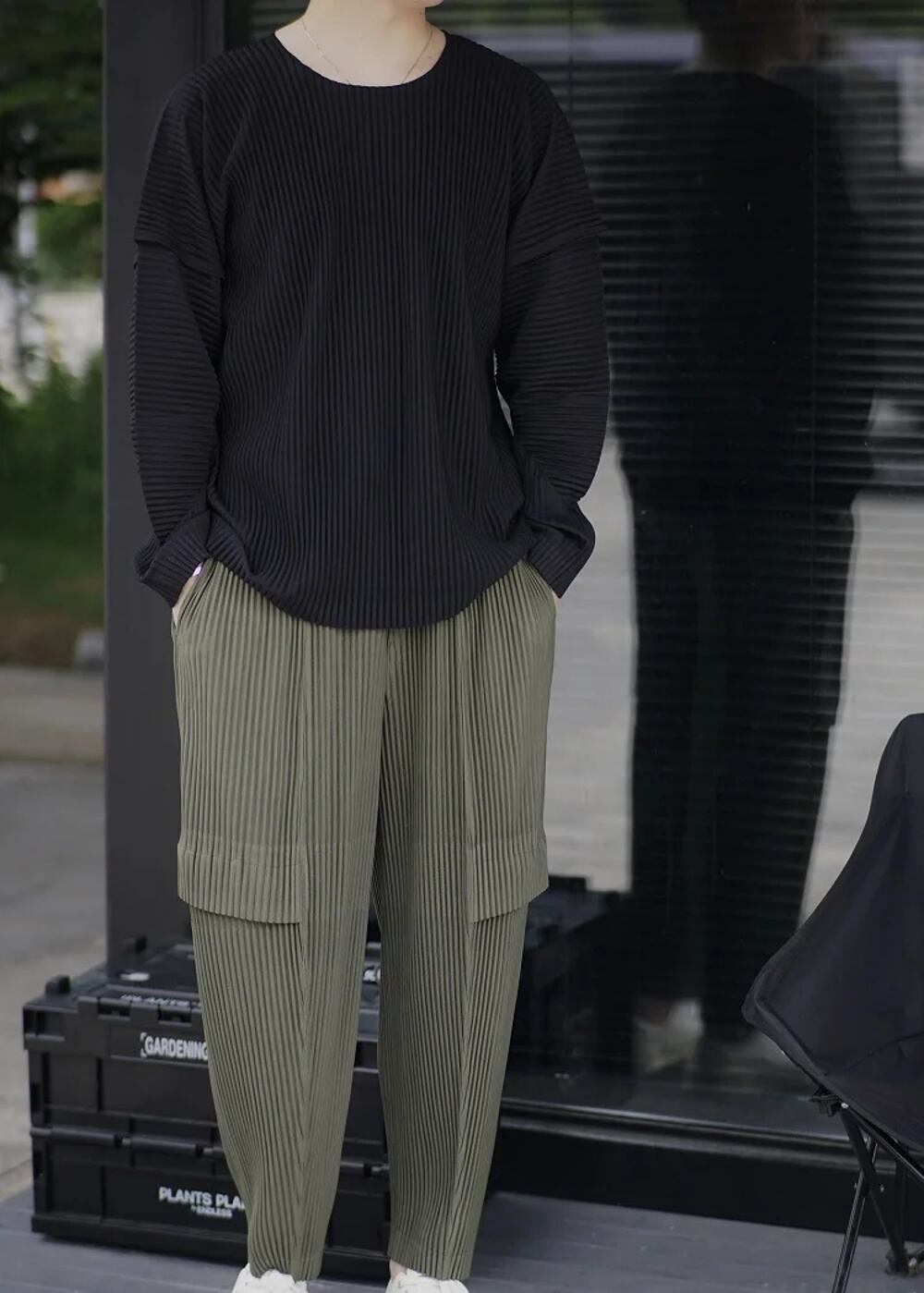 男性用miyakeプリーツカーゴパンツ、ルーズファッション、カジュアルストリートウェア、9ポイント ボトム ワイドレッグ バギーパンツ T240901065811_01