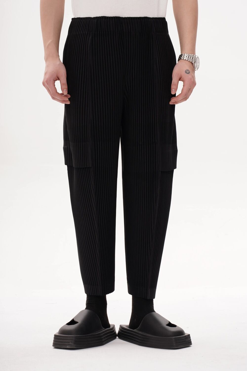 男性用miyakeプリーツカーゴパンツ、ルーズファッション、カジュアルストリートウェア、9ポイント ボトム ワイドレッグ バギーパンツ T240901065811_02