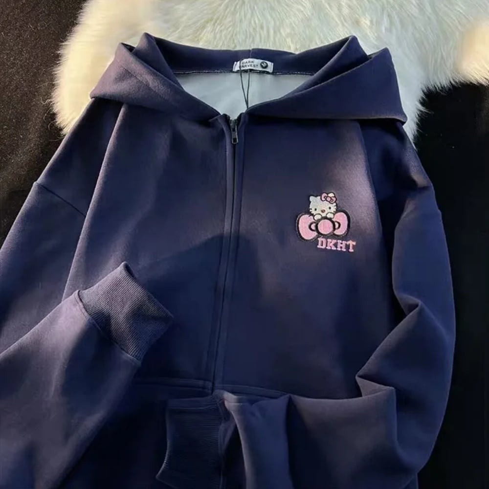 女性のためのハローキティ刺zipジップパーカー、アメリカのヴィンテージかわいい大学スタイル、カップルコート、ルーズストリートウェア、怠惰なカジュアルな2kトップス ボトム ワイドレッグ バギーパンツ T240901070134_01