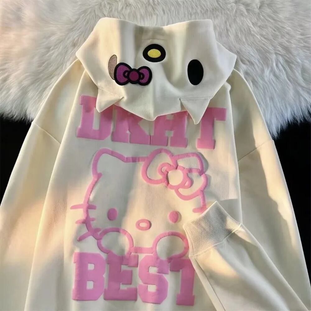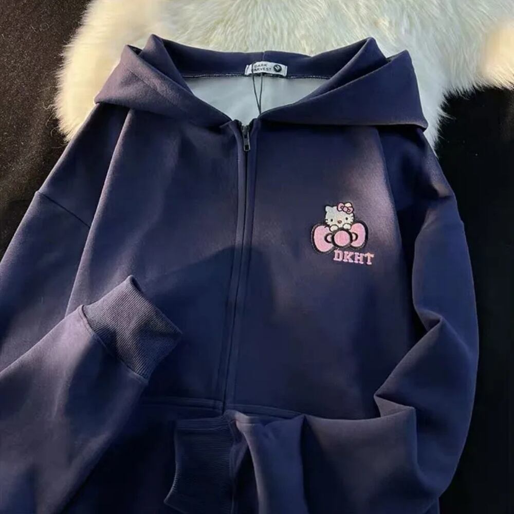 女性のためのハローキティ刺zipジップパーカー、アメリカのヴィンテージかわいい大学スタイル、カップルコート、ルーズストリートウェア、怠惰なカジュアルな2kトップス ボトム ワイドレッグ バギーパンツ T240901070134_02