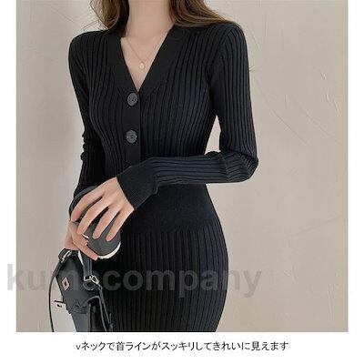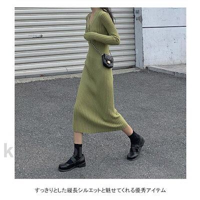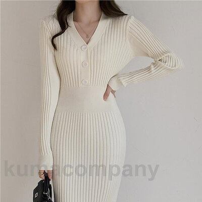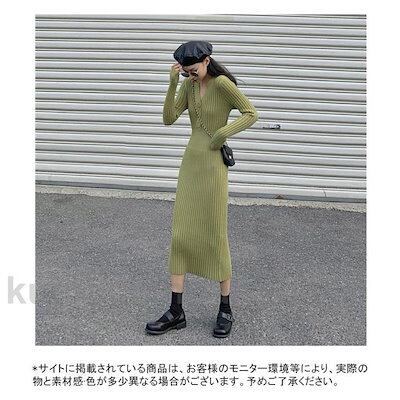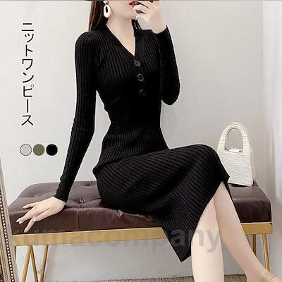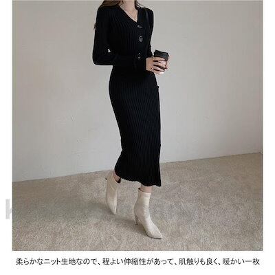 ワンピース 長袖 ロングワンピ レディース マキシ丈 ニットワンピース プリーツ Vネック タイトフィット リブ シンプル 美シルエット 秋冬