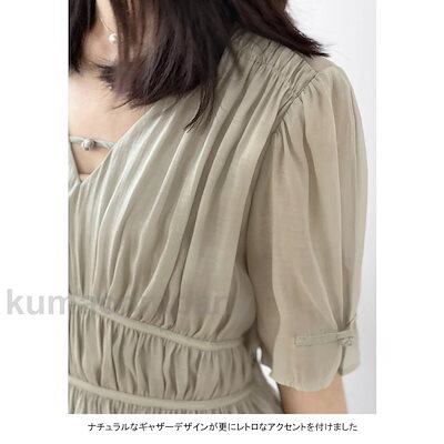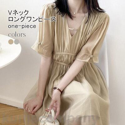 ワンピース ロング 夏 半袖 ギャザーワンピース レディース ロングワンピ マキシ丈 Vネック レトロ 半袖ワンピース ハイウエスト プレゼント