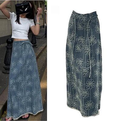 レディース ボディコン Aライン タイ結び バックスリット ロングスカート デニムフリンジ レデイース服スカートデニムスカートロングスカート25新作薄型マキシ丈フラワー刺繍